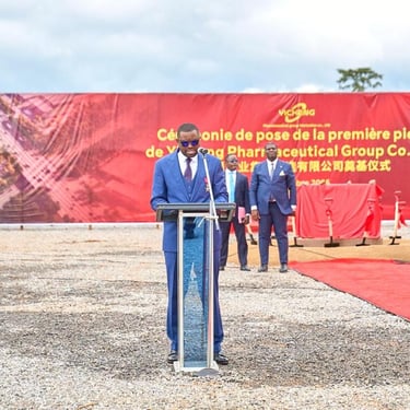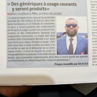 En parallèle de mon engagement dans le service public et associatif, je suis le porteur d'un projet industriel d'envergure, visant à contribuer de manière significative à la souveraineté sanitaire du Cameroun et à la réduction de notre dépendance aux importations. Je suis à l'origine du projet de construction d'une usine pharmaceutique majeure. Cette unité de production sera dotée d'une capacité annuelle de 100 millions de flacons, 2 milliards d'ampoules, et 10 milliards de comprimés. L'objectif est de produire localement des médicaments génériques d'usage courant, des produits hospitaliers essentiels et des médicaments prioritaires. Initialement destiné à un autre pays de la sous-région, j'ai réussi à orienter ce projet vers le Cameroun, prouvant que la jeunesse camerounaise peut être à l'avant-garde des grandes transformations en alliant expertise, vision et patriotisme. Ce projet est un puissant vecteur de croissance inclusive et témoigne de ma volonté d'utiliser mon réseau (notamment avec des partenaires asiatiques, comme mentionné précédemment) pour capter des investissements stratégiques et structurants pour mon pays.